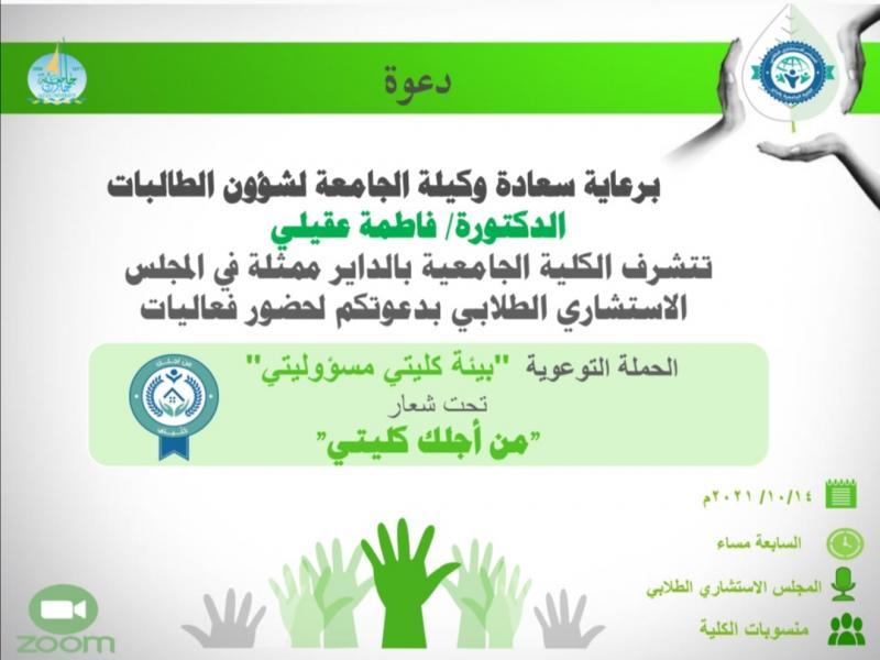 برعاية وكيلة الجامعة لشؤون الطالبات الدكتورة فاطمة عقيلي، نظمت الكلية الجامعية بالداير ممثلة في المجلس الاستشاري الطلابي فعاليات الحملة التوعوية "بيئة كليتي مسؤوليتي" تحت شعار "من أجلك كليتي" عبر منصة زووم.