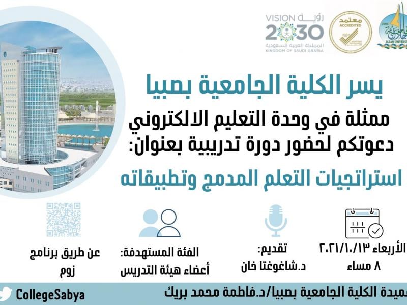 نظمت الكلية الجامعية بصبيا متمثلةً بوحدة التعليم الالكتروني دورة تدريبية بعنوان ” استراتيجيات التعلم المدمج وتطبيقاته قدمتها د. شاغوفتا خان عبر تطبيق الزوم استهدفت أعضاء هيئة التدريس بالكلية.