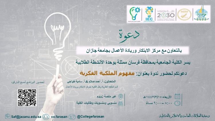 بدعوة من الكلية الجامعية بمحافظة فرسان، قدمت وحدة الابتكار وريادة الأعمال بجامعة جازان ممثلة في قسم الملكية الفكرية ونقل التقنية لقاء بعنوان "مفهوم الملكية الفكرية ومجالاتها " عبر منصة زووم ، وذلك بحضور عميدة الكلية الجامعية بمحافظة فرسان، الدكتورة عفاف بابعير ومشرفة الأنشطة. وشارك في اللقاء الأستاذ علي صلام والأستاذة سامية خواجي من قسم الملكية الفكرية بوحدة الابتكار.