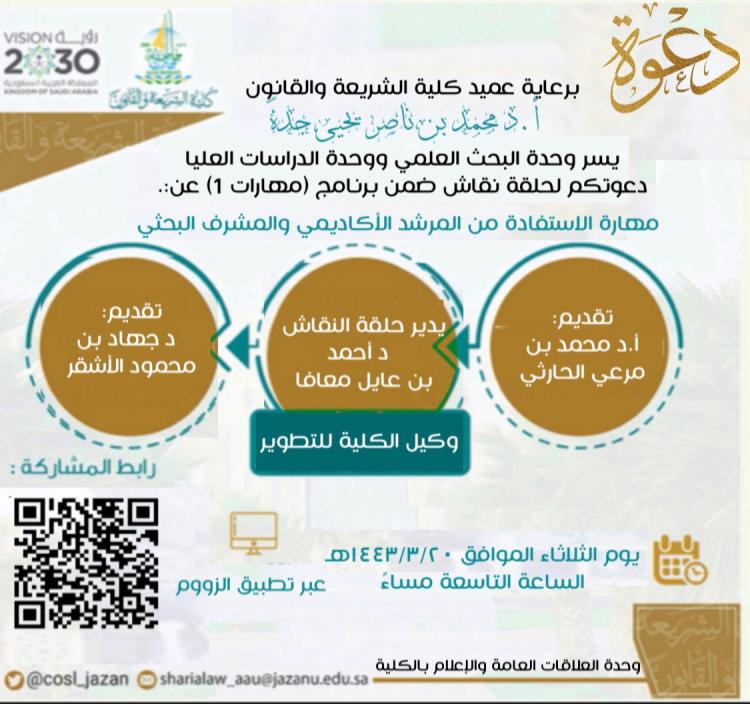 عقدت وحدة الدراسات العليا ووحدة البحث العلمي بكلية الشريعة والقانون حلقة نقاش بعنوان مهارة الاستفادة من المرشد الأكاديمي والمشرف البحثي ضمن برنامج "مهارات" بدأها مشرف وحدة البحث العلمي الدكتور: صقر طوهري بمقدمة موجزة رحب فيها بالوكلاء، وأعضاء هيئة تدريس، وطلاب ماجستير، وطلاب وطالبات البكالوريوس.