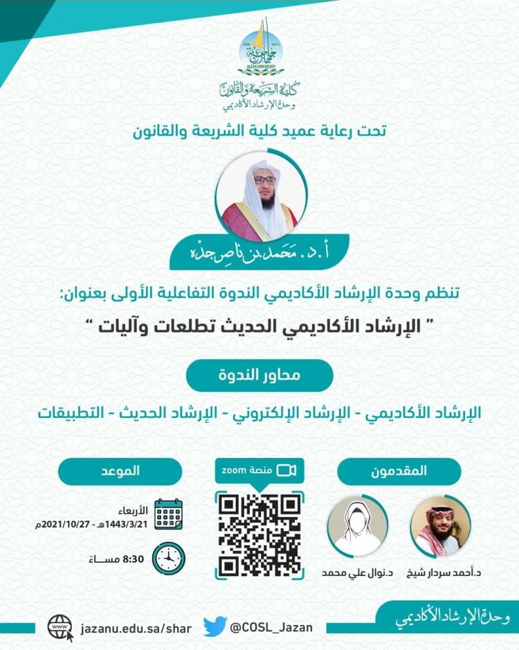 نظمت وحدة الإرشاد الأكاديمي في كلية الشريعة والقانون ندوة تفاعلية بعنوان " الإرشاد الأكاديمي الحديث آليات وتطلعات " بغرض تطوير مستوى الخدمة الإرشادية المقدمة لطلاب الكلية، والمساهمة في تحديث الآليات لتنمية المهارات الأكاديمية والحياتية المختلفة.