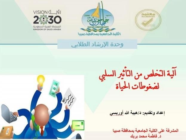 نظمت الكلية الجامعية بصبيا متمثلة بوحدة الإرشاد الطلابي ندوة إرشادية بعنوان "آلية التخلص من التأثير السلبي لضغوطات الحياة"، قدمتها د/ هيبة الله أوريسي على برنامج "الزوم"، حيث تستهدف هذه الفعالية طالبات الكلية، وقد شهدت الندوة حضور عدد من الطالبات. وتم التطرق للعناصر التالية: ماهية ضغوط الحياة، أنواع ضغوطات الحياة، تأثيرات ضغوطات الحياة ، مصادر الضغوط، طرق التعامل مع ضغوطات الحياة ،إدارة ضغوط الحياة، - آلية التخلص من الضغط.