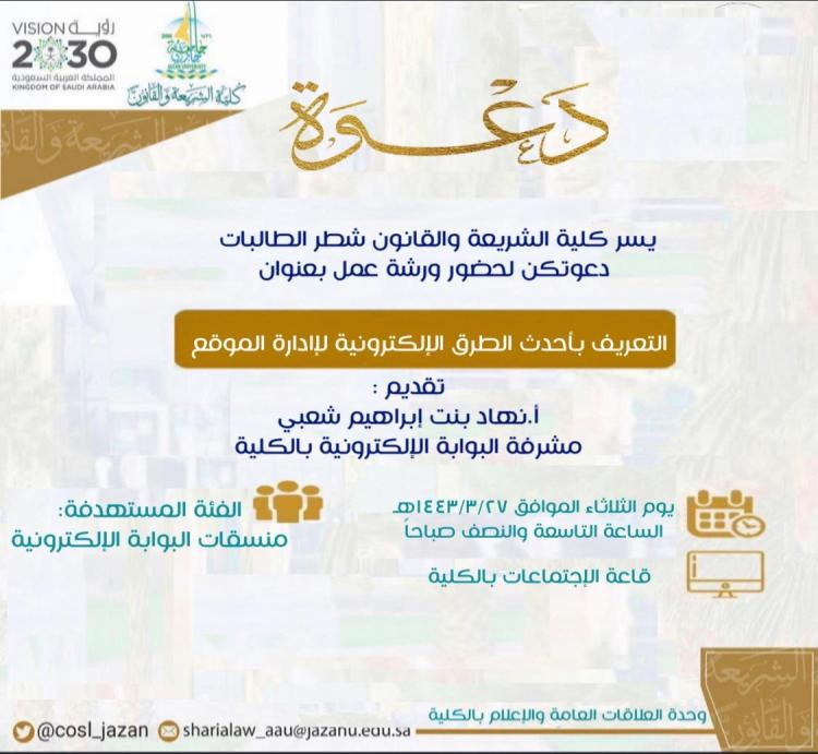 نفذت مشرفة البوابة الإلكترونية بكلية الشريعة والقانون شطر الطالبات الأستاذة نهاد بنت إبراهيم شعبي ورشة عمل بعنوان "التعريف بأحدث الطرق الإلكترونية لإدارة الموقع".