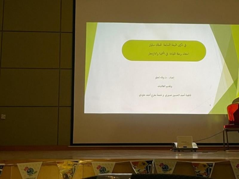 كما توالت فقرات الحفل بفقرة عن تطورات التي شهدتها المملكة تحت قيادته الرشيدة بمشاركة من قسم اللغة الإنجليزية مع الطالبة سارة محمد بعنوان " Kingdom's Developments Under King Salman Leadership" ".