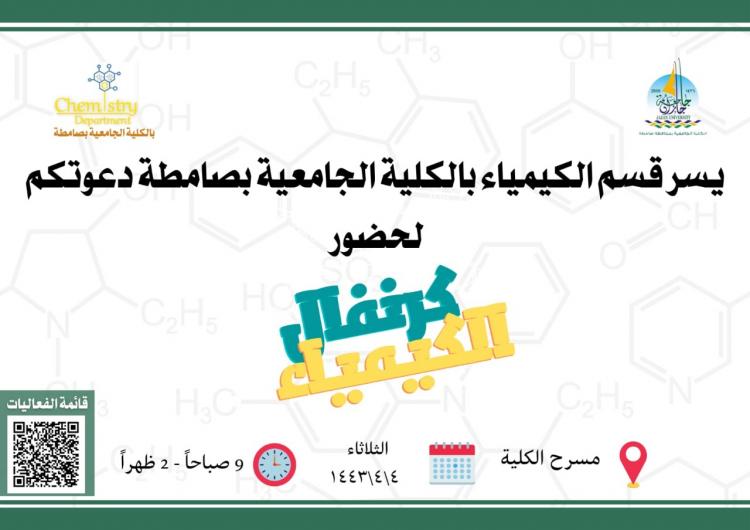 برعاية عميدة الكلية الجامعية بصامطة أطلق قسم الكيمياء بالتعاون مع وحدة النشاط الطلابي (كرنفال الكيمياء) العلمي. اشتمل الكرنفال برنامجاً علمياً ثرياً وماتعاً وحماسياً. تم تقديم ورشة عمل بعنوان (الكيمياء في حياتنا ) نفذتها د. منال ركابي، أ. ندى فقيهي، والطالبات رهف مشهور، مريم محزري، لورا مباركي، اسراء جبيلي. تحدثن عن الكيمياء في جسم الإنسان وأنشطته اليومية، كذلك الكيمياء في البيئة، والطب، و مستحضرات الصحة والجمال، وأوضحن كيف عملت الكيمياء على تحقيق رغبة الإنسان بعيش حياة أفضل. كذلك تناولن دور الكيمياء في الغذاء و جانب الزراعة والصناعة. تلى ذلك عرض فيلم وثائقي يتحدث عن حاضر وماضي علم الكيمياء. ثم انتقلن إلى (بيت الرعب الجنائي) الذي اشتمل على مسرح جريمة افتراضي ليتم استخدام الكيمياء الجنائية أثناء مجريات التحقيق والوصول إلى الجاني الحقيقي. وقد صاحب البرنامج معرضاً علمياً برزت فيه إبداعات ومواهب طالبات قسم الكيمياء، وقد شمل على عدة أركان منها، ركن الكيمياء في حياتنا، ركن التجارب، ركن اصنعها بنفسك، ركن كيمياؤنا شغفنا، ركن انتعش لِتعش، و ركن خدمة المجتمع، كذلك ركن التصوير. وتقدمت عميدة الكلية بالشكر والتقدير للجنة المنظمة والمنفذة لهذا الكرنفال من منسوبات وطالبات.
