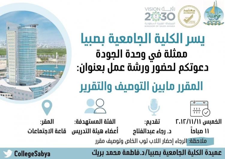 نظمت الكلية الجامعية بصبيا متمثلة بوحدة الجودة ورشة عمل بعنوان "المقرر ما بين التوصيف والتقرير" قدمتها أ. رجاء عبد الفتاح محمد ابراهيم حيث استهدفت الورشة أعضاء هيئة التدريس، تناولت الورشة عدة محاور: العلاقة ما بين توصيف البرنامج وتوصيف المقرر، آلية عمل الخطة الدراسية، كيفية كتابة تقرير المقر على ضوء المخرجات، وضع الخطط المستقبلية، وفي النهاية اختتمت الورشة سعادة عميدة الكلية بالشكر والثناء للحضور الكريم.