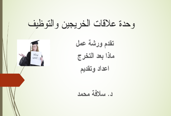 نظمت وكالة الكلية الجامعية بالداير للشؤون الأكاديمية ممثلة في وحدة علاقات الخريجين والتوظيف بالتعاون مع وحدة الإرشاد النفسي ضمن برامج خطة تدريب الخريجين ورشة عمل بعنوان (ماذا بعد التخرج) من إعداد وتقديم سلافة محمد أحمد عضو هيئة التدريس بقسم اللغة الإنجليزية ومنسقة وحدة علاقات الخريجين بالكلية تحت رعاية عميدة الكلية الجامعية بمحافظة الدائر الدكتورة تنوير هندي.