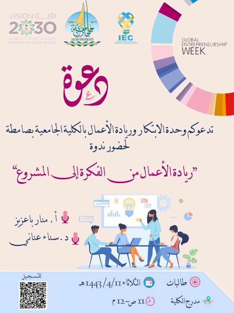 نظّمت وحدة الابتكار وريادة الأعمال في الكلية الجامعية بصامطة ندوة بعنوان (ريادة الأعمال من الفكرة إلى المشروع). نفذتها د.سناء عناني وأ. منار باعزيز، استهدفت طالبات الكلية.