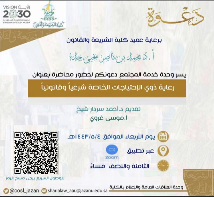 برعاية عميد كلية الشريعة والقانون الأستاذ الدكتور محمد بن ناصر يحيى جدّه نفذت وحدة خدمة المجتمع محاضرة بعنوان(رعاية ذوي الاحتياجات الخاصة شرعياً وقانونياً)