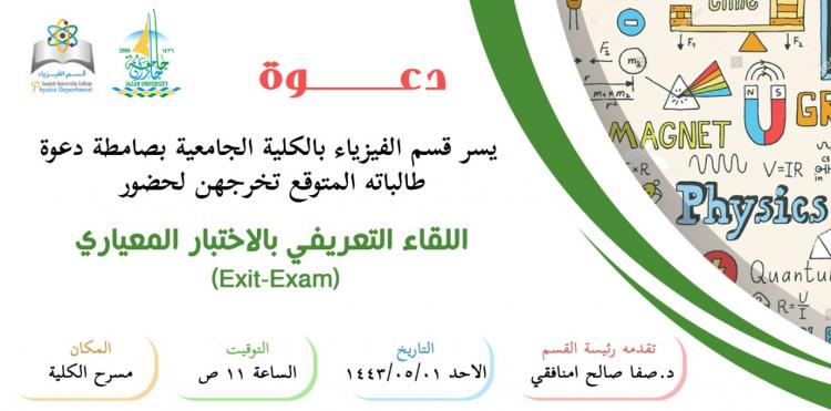 نظمت الكلية الجامعة بصامطة ممثلةً في قسم الفيزياء (اللقاء التعريفي بالاختبار المعياري) الذي استهدف طالبات القسم المتوقع تخرجهن وكان اللقاء أيضا مفتوحاً لجميع طالبات القسم لتعم الفائدة.