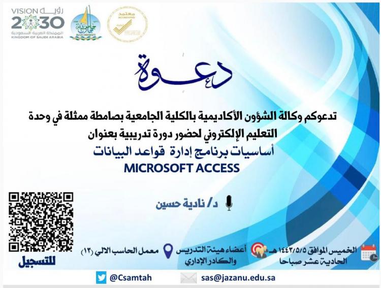 نفذت الكلية الجامعية بصامطة ممثلةً في وحدة التعليم الإلكتروني دورة تدريبية بعنوان (أساسيات برنامج إدارة قواعد البيانات Microsoft Access) قدمتها د.نادية حسين واستهدفت الكادر الأكاديمي والإداري.