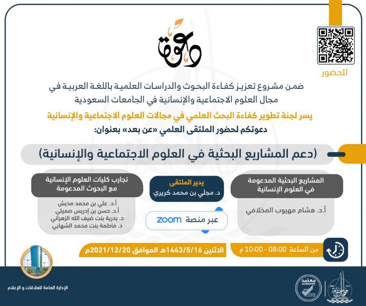 ضمن مشروع تعزيز كفاءة البحوث العلمية باللغة العربية في مجالات العلوم الاجتماعية والإنسانية في الجامعات السعودية نظمت وكالة الجامعة للدراسات العليا والبحث العلمي بجامعة جازان ممثلة في لجنة تطوير كفاءة البحث العلمي ورشة عمل بعنوان (دعم المشاريع البحثية في العلوم الاجتماعية والإنسانية)، شارك فيها عدد من أعضاء هيئة التدريس بالجامعة .