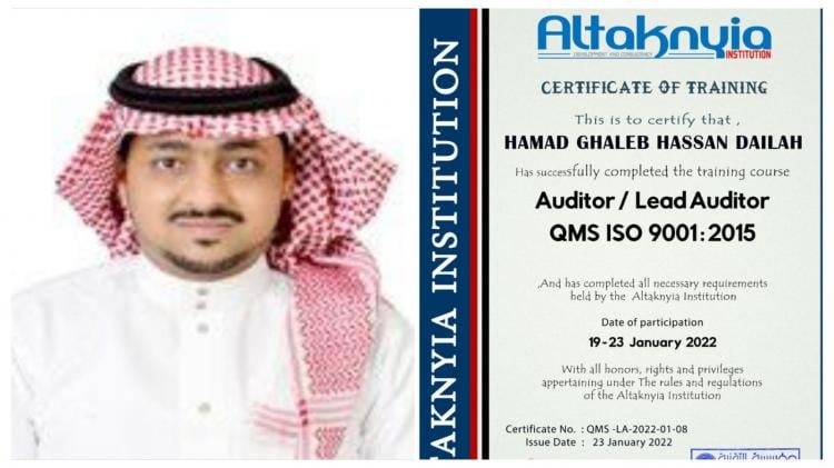 تهنئ كلية التمريض سعادة وكيل الكلية للبحث والتطوير الدكتور حمد بن غالب آل دائلة لحصوله على شهادة كبير مدققي ايزو 9001 متمنين له دوام التوفيق والسداد .