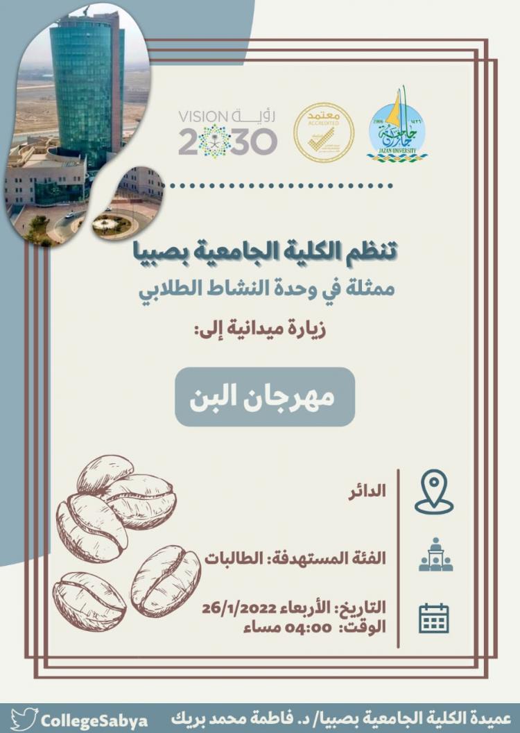 نفذت الكلية الجامعية بصبيا ممثلةً في وحدة النشاط الطلابي وبإشراف عميدة الكلية د. فاطمة بريك زيارة ميدانية إلى مهرجان البن في محافظة الدائر شارك فيها عدد من منسوبات الكلية وطالباتها.