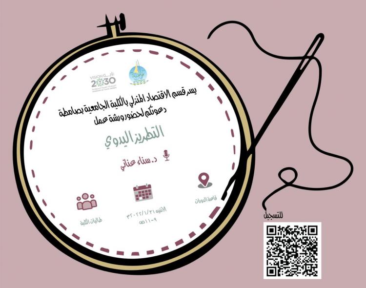 أقامت الكلية الجامعية بصامطة ممثلةً في قسم الاقتصاد المنزلي ورشة عمل بعنوان (التطريز اليدوي)، نفذتها الدكتورة سناء عناني.