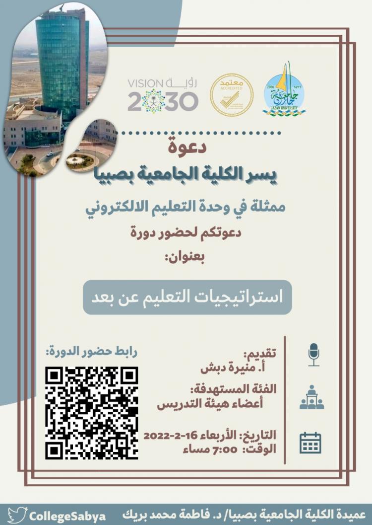 نظمت الكلية الجامعية بصبيا ممثلة بوحدة التعليم الالكتروني دورة تدريبية بعنوان: استراتيجيات التعليم قدمتها أ.منيرة دبش عبر تطبيق زوم ، استهدفت أعضاء هيئة التدريس تناولت عدد من المحاور أبرزها: صفات المعلم والمتعلم الالكتروني، ومهارات المعلم الالكتروني، والمهارات الشخصية، التقنية، التربوية، وعناصر الدرس الالكتروني الناجح، وإدارة الصف الالكتروني، ومفاهيم يجب تعلمها، ومهارات التدريس الالكتروني.