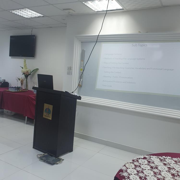 نظمت الكلية الجامعية بأبي عريش ممثلة بقسم اللغة الإنجليزية ورشة عمل كيفية تدريس اللغة الإنجليزية باستخدام طريقة CELTA البريطانية نفذتها مدربة تابعة لمعهد اللغة الإنجليزية وتم مناقشة عدد من المواضيع في تدريس مهارات اللغة الإنجليزية الأساسية.