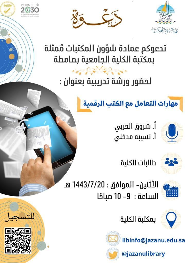 نظمت مكتبة الكلية الجامعية بصامطة ورشة تدريبية بعنوان "مهارات التعامل مع الكتب الرقمية" لطالبات الكلية.