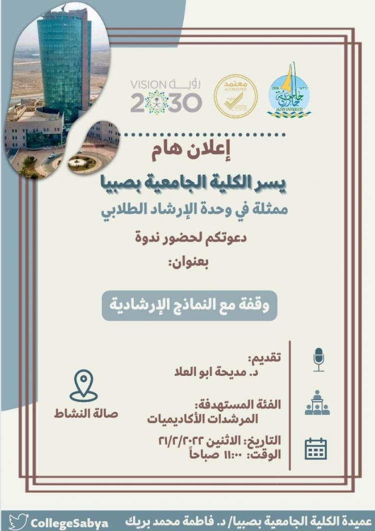 نظمت الكلية الجامعية بصبيا ممثلةً بوحدة الإرشاد الطلابي ندوة إرشادية بعنوان” وقفة مع النماذج الإرشادية ". قدمتها د. مديحه على أبو العلا رئيسة وحدة الإرشاد الطلابي استهدفت المرشدات الأكاديميات.