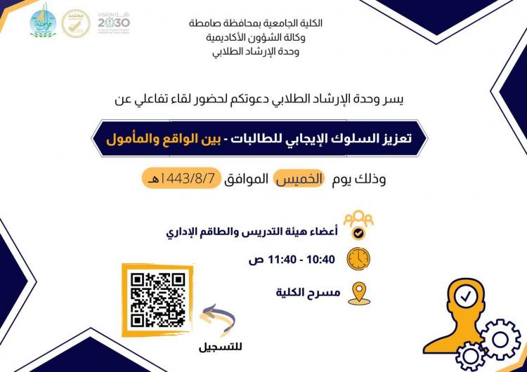 نظمت الكلية الجامعية بصامطة ممثلة في وحدة الإرشاد الطلابي لقاء تفاعلي عن تعزيز السلوك الإيجابي للطالبات بين الواقع والمأمول قدمتها الدكتورة أميرة سماحة والأستاذة نهاد فقيهي استهدفت أعضاء هيئة التدريس والطاقم الإداري وتم خلالها توضيح محاور اللقاء والذي تطرق إلى سلوك الطالبات في الحرم الجامعي وتوضيح أهمية حقوق وواجبات الطالبة الجامعية.