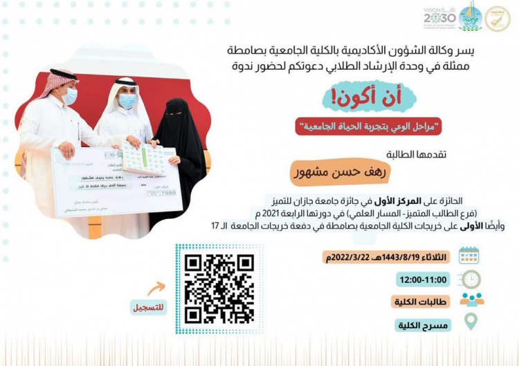 وتأتي هذه الندوة إيمانا بدور الطالبة كأفضل مرشد لطالبة أخرى خلال مسيرتها الجامعية وإسهاما في نشر عدوى التميز والإبداع بين الطالبات.