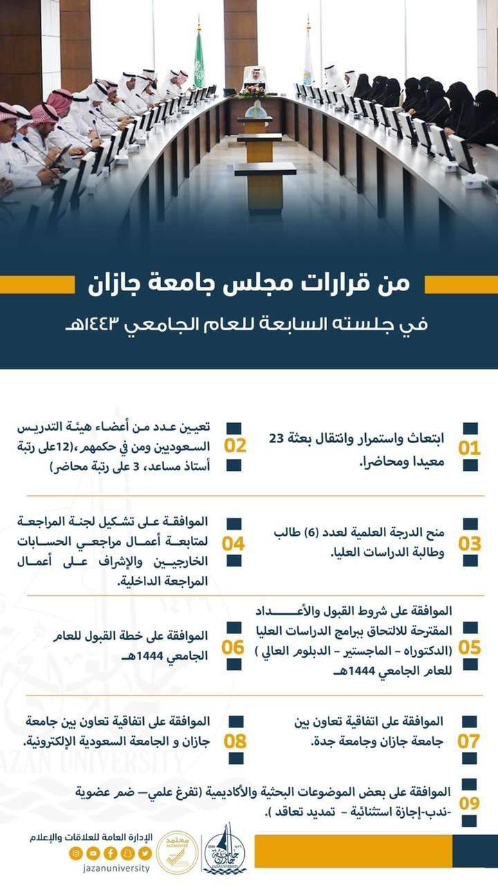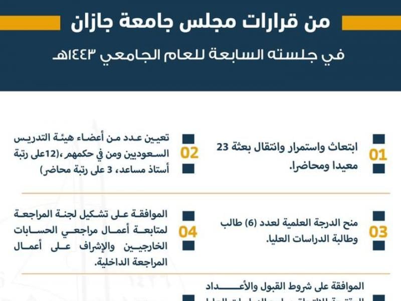 وأوضح وكيل الجامعة للدراسات العليا والبحث العلمي أمين مجلس الجامعة الأستاذ الدكتور محمد بن حسن أبو راسين أن المجلس وافق على مجموعة من القرارات ومنها: تعيين عدد من أعضاء هيئة التدريس السعوديين ومن في حكمهم، 12على رتبة أستاذ مساعد، و 3 على رتبة محاضر، وابتعاث واستمرار وانتقال بعثة 23 معيدا ومحاضرا، ومنح الدرجة العلمية لـ 6 من طلبة الدراسات العليا، والموافقة على تشكيل لجنة المراجعة لمتابعة أعمال مراجعي الحسابات الخارجيين والإشراف على أعمال المراجعة الداخلية، والموافقة على شروط القبول والأعداد المقترحة للالتحاق ببرامج الدراسات العليا للعام الجامعي 1444هـ، والموافقة على خطة القبول للعام الجامعي 1444هـ، الموافقة على اتفاقية تعاون بين جامعة جازان وجامعة جدة، والموافقة على اتفاقية تعاون بين جامعة جازان و الجامعة السعودية الإلكترونية.