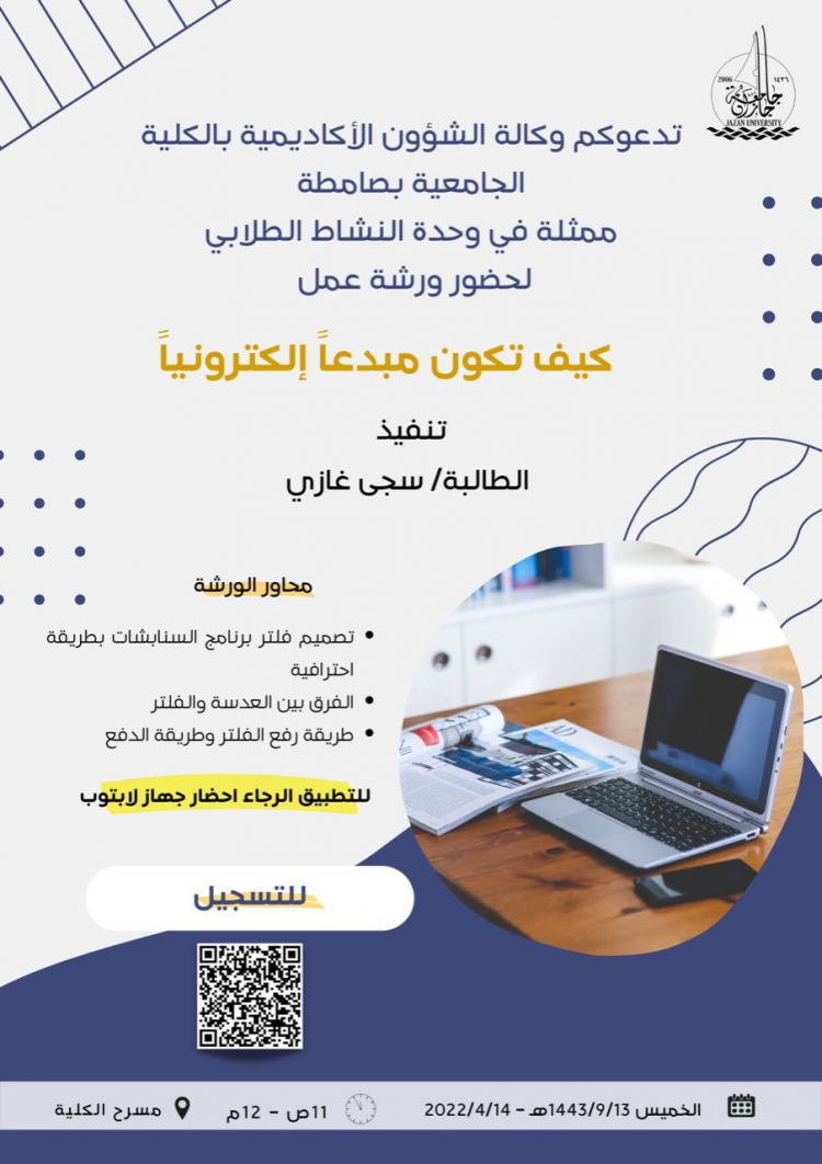 نفذت وحدة النشاط الطلابي بالكلية الجامعية بمحافظة صامطة ورشة عمل بعنوان "كيف تكون مبدعاً إلكترونياً"، قدمتها الطالبة سجى غازي.