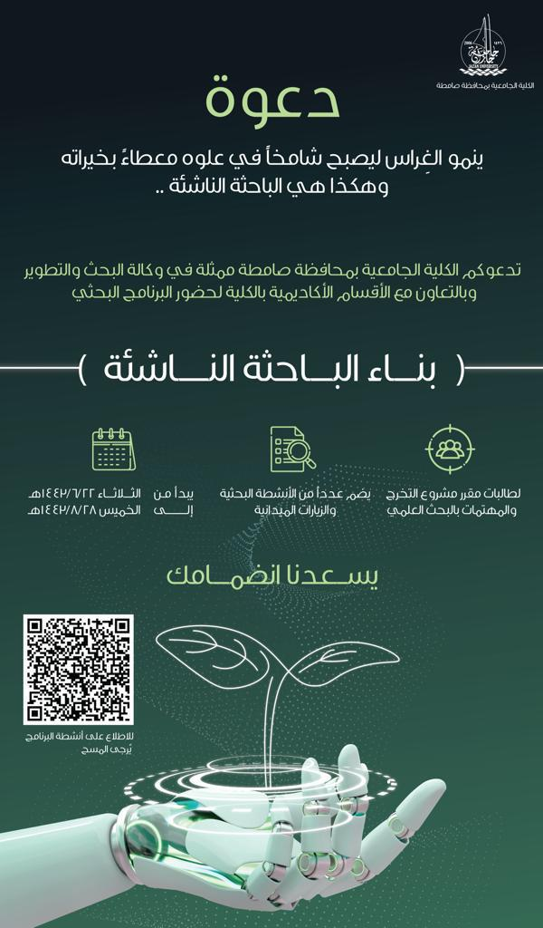 نظمت وكالة البحث والتطوير في الكلية الجامعية بمحافظة صامطة بالتعاون مع الأقسام الأكاديمية بالكلية برنامجاً بحثياً بعنوان (بناء الباحثة الناشئة) استهدف الطالبات المسجلات في مقرر مشروع التخرج في الأقسام المختلفة وجميع المهتمات بالبحث العلمي.