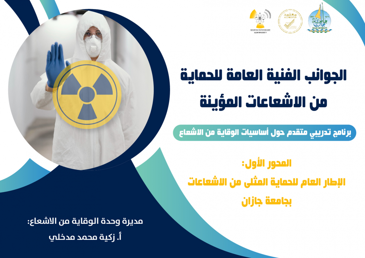 أقامت وحدة الوقاية من الاشعاع برنامجاً تدريبياً متقدماً بعنوان (الجوانب الفنية العامة للحماية من الإشعاعات المؤينة) على مدى خمسة أيام بإشراف وتوجيهات وكيل الجامعة للتطوير وريادة الأعمال الدكتور نايف أزيبي بهدف التوعية بالمفاهيم الأساسية حول الإشعاع والوقاية من أضراره وتوضيح الإطار الرقابي الواجب تطبيقه على الممارسات الإشعاعية في جامعة جازان.