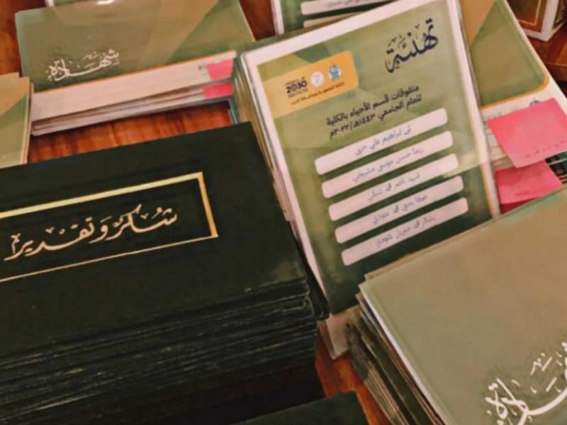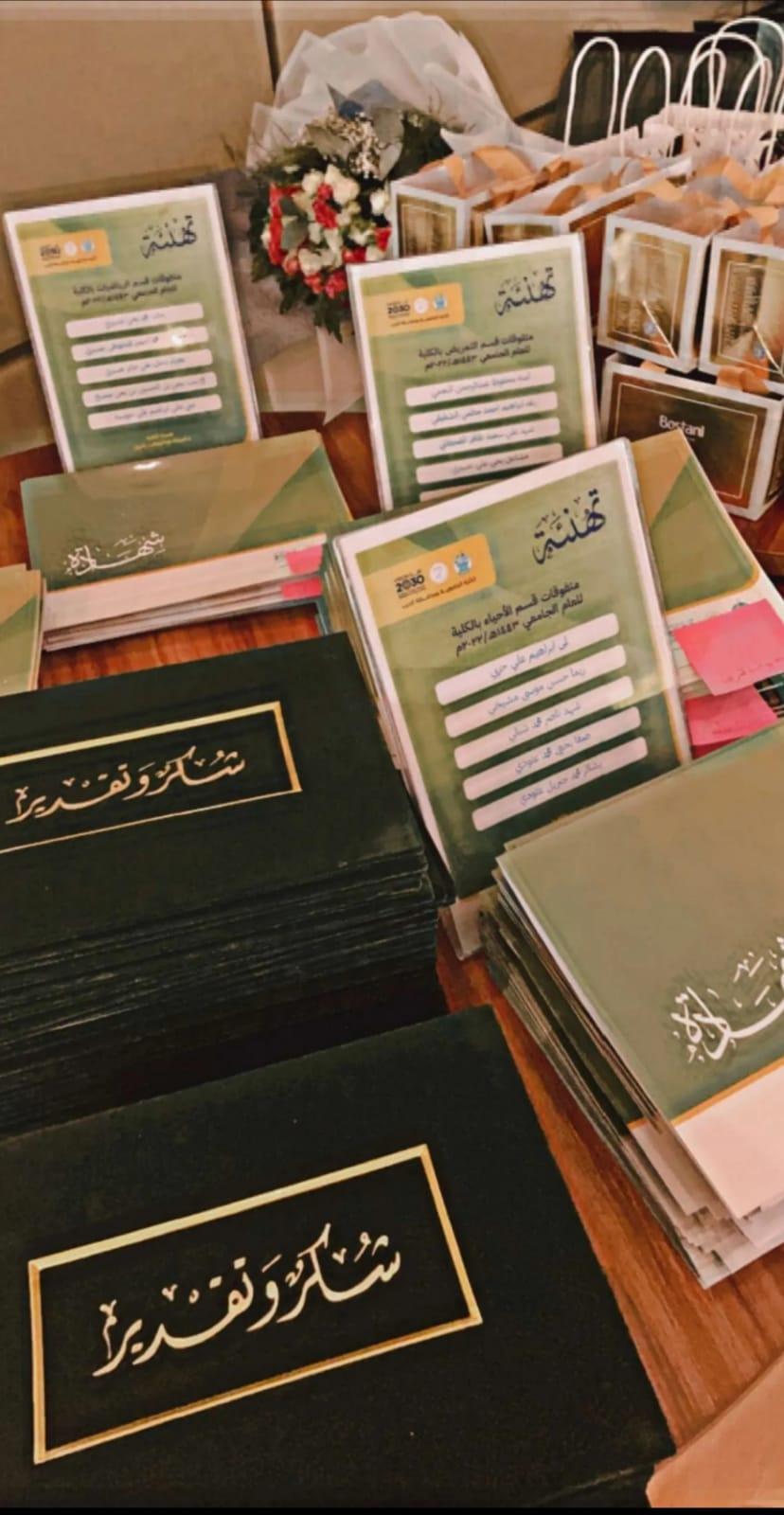 بعد ذلك قامت العميدة بتكريم كل من منسوبات وطالبات الكلية (المتفوقات من كل قسم – المتميزات في الانشطة الطلابية - المجتازات الاختبار المعياري - المتطوعات)، واختتم الحفل بتوزيع الهدايا والشهادات التقديرية.
