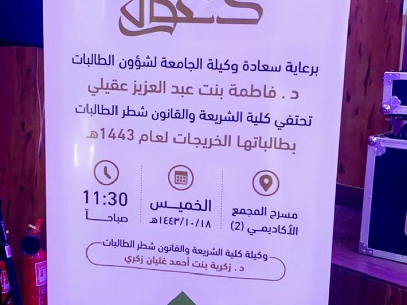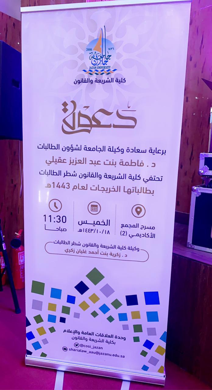 برعاية وكيلة جامعة جازان لشؤون الطالبات الدكتورة فاطمة بنت عبدالعزيز عقيلي نظمت كلية الشريعة والقانون شطر الطالبات حفل تخرج طالباتها للعام الجامعي ١٤٤٣هـ بحضور عدد من وكيلات ومنسوبات الجامعة.