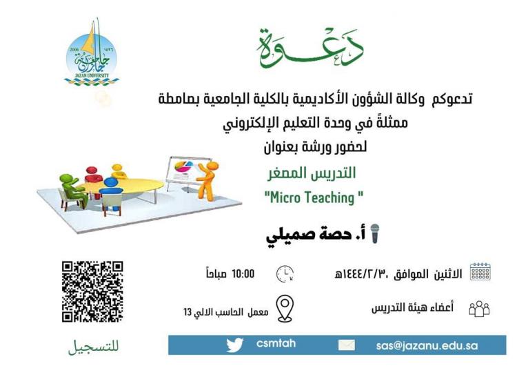 نفذت الكلية التطبيقية بصامطة ورشة عمل بعنوان التدريس المصغر استهدفت عضوات هيئة التدريس بالكلية، وبدأتها المحاضرة حصة صميلي بتعريف التدريس المصغر وخصائصه وأنواعه، ثم تطرقت إلى خطوات تطبيقه ومعايير استخدامه.