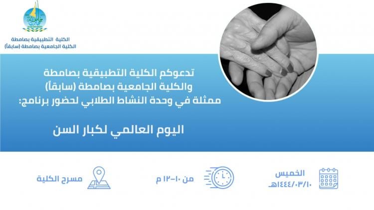 تزامناً مع اليوم العالمي لكبار السن، نفذت الكلية التطبيقية بصامطة فعالية مثرية لتسليط الضوء على الدور المهم والحيوي لكبار السن، وما قدموه من إسهامات لخدمة الوطن والمجتمع وذلك من خلال التركيز على أهداف اليوم العالمي لكبار السن، والتوعية باحتياجات كبار السن واهتماماتهم، والإشادة بجهود القائمين على القطاع الصحي والاجتماعي لرفع مستوى الخدمات المقدمة لهذه الفئة، ودعمهم صحياً ونفسياً والاحتفاء بإنجازاتهم.