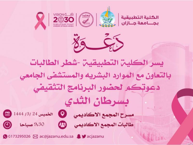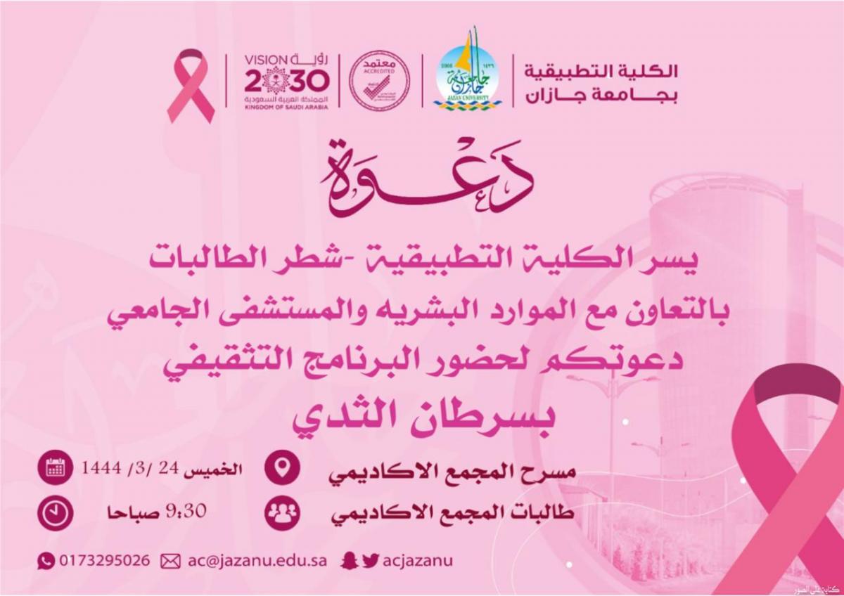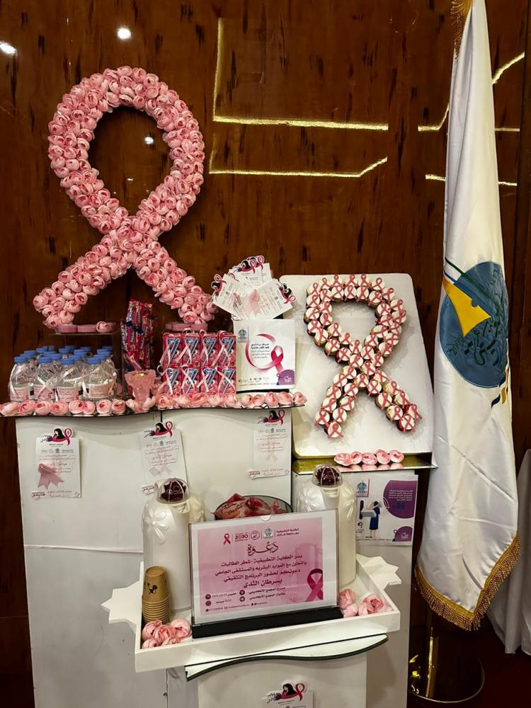 نفذت الكلية التطبيقية ممثلة بوحدة العلاقات العامة والنشاط الطلابي بالتعاون مع عمادة الموارد البشرية والمستشفى الجامعي برنامجا تثقيفيا بمناسبة الشهر العالمي لسرطان الثدي تحت شعار رايتك وردية الذي يقام في شهر اكتوبر من كل عام بحضور كليات المجمع الأكاديمي 1-2 بإقامة أركان توعوية لسرطان الثدي.