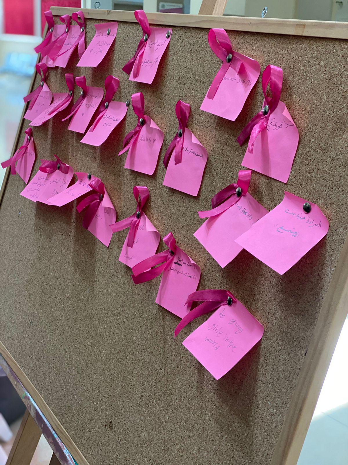 وألقت بعض الطالبات كلمات إرشادية عن مرض " سرطان الثدي "بهدف نشر الوعي حول أسباب المرض وطرق الوقاية منه، كما صاحب الفعالية المقامة في بهو المجمع الأكاديمي 2 ركنًا للرسم ،وشهدت الفعالية حضورًا كبيرًا من الطالبات ومنسوبات الكلية .