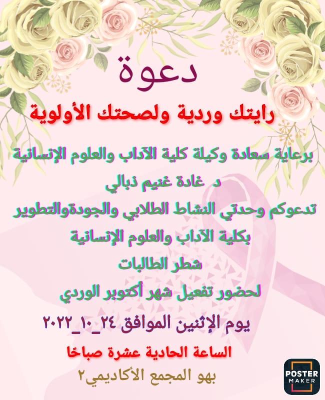 اكتست كلية الآداب والعلوم الإنسانية شطر الطالبات باللون الوردي تفعيلًا للاحتفاء بشهر أكتوبر الوردي، برعاية وكيلة الكلية الدكتورة غادة غنيم ذبالي حيث شاركت وحدتا النشاط الطلابي والجودة والتطوير ممثلة في مبادرتها " بصمة تطوير "من خلال " التثقيف الصحي " للهيئة الإدارية، فقُدمت سلال من الطعام الصحي بوصفها مشاركة توعوية للإداريات لحثهم على اتباع نظام غذائي صحي يحافظ علي صحتهن ويحفز طاقاتهن الإنتاجية ،تحقيقًا لأهم أهداف المبادرة في التطوير المهني والأكاديمي.