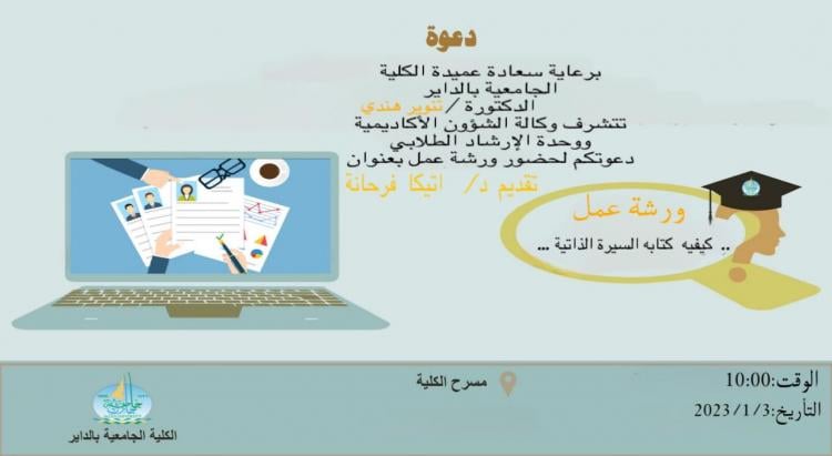 قدمت وكالة الشؤون الأكاديمية ممثلة في وحدة الإرشاد الطلابي في الكلية الجامعية بمحافظة الداير ورشة عمل بعنوان كيفية كتابة السيرة الذاتية بمسرح الكلية قدمتها أ. اتيكا فرحانة.