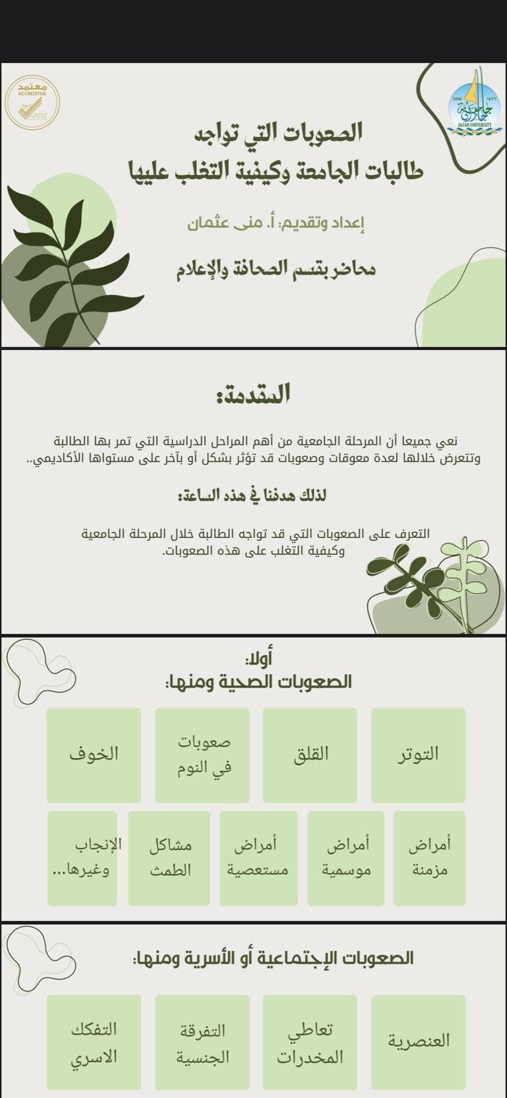 الصعوبات التي تواجه طالبات الجامعة في كلية الآداب والعلوم الإنسانية شطر الطالبات