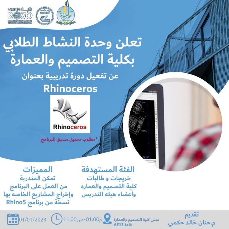 نظمت وحدة الأنشطة الطلابية بشطر الطالبات بكلية التصميم والعمارة دورة بعنوان (أساسيات برنامج الراينو ) قام بإعدادها وتنفيذها الأستاذة حنان خالد حكمي وتنظيم وأشراف الأستاذة فادية هشام