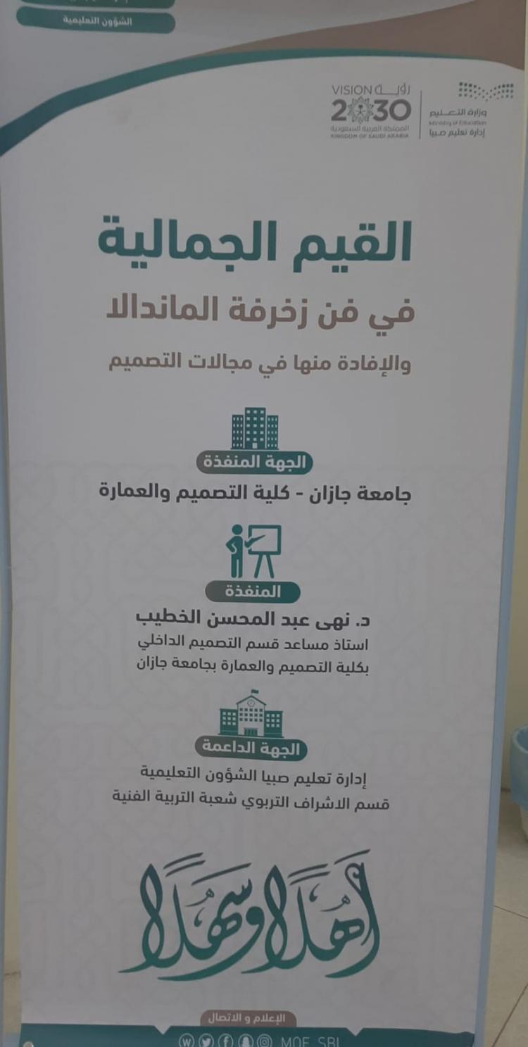 نفذت كلية التصميم والعمارة اليوم ممثلة في وحدة خدمة المجتمع بالشراكة مع إدارة تعليم صبيا ورشة عمل " القيم الجمالية في فن زخرفة الماندالا والإفادة منها في مجالات التصميم" نفذتها الدكتورة نهى عبد المحسن الخطيب أستاذ مساعد بقسم التصميم الداخلي.