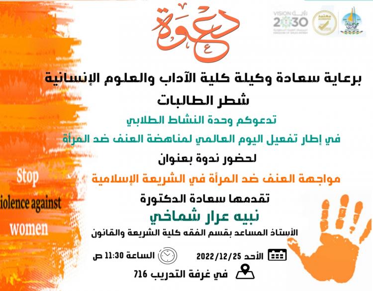 قدمت وحدة النشاط الطلابي بكلية الآداب والعلوم الإنسانية شطر الطالبات ندوة بعنوان" مواجهة العنف ضد المرأة في الشريعة الإسلامية" ألقتها الدكتورة نبيه شماخي الأستاذ المساعد بقسم الفقه كلية الشريعة والقانون، و ذلك في إطار تفعيل اليوم العالمي لمناهضة العنف ضد المرأة وتزامنا مع اليوم العالمي لحقوق الإنسان، وذلك بمقر المجمع الأكاديمي 2 .