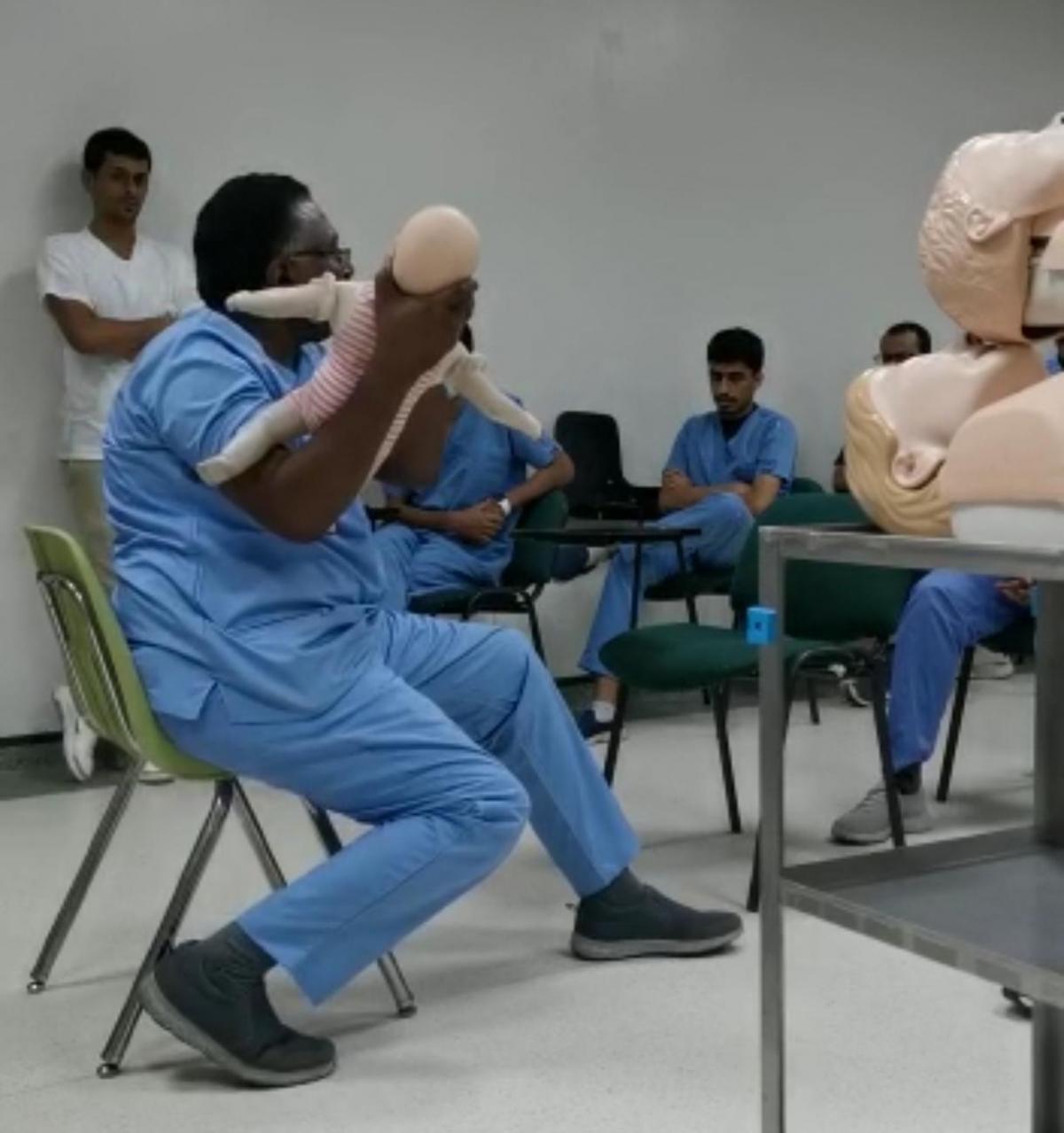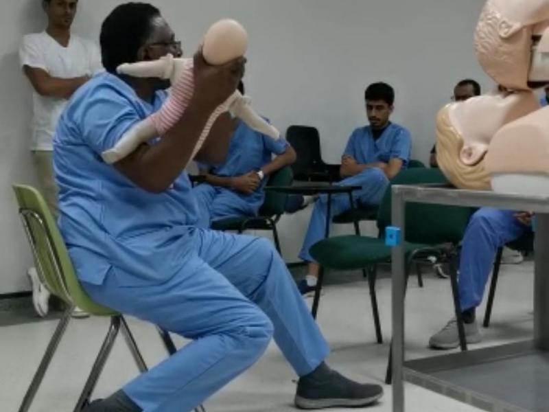 د. ياسر بابكر بشرح وتطبيق طريقة الإنعاش القلبي الرئوي على دمى تحاكي الواقع ومن ثم توزيع المتدربين في غرف المحاكاة والتدريب على طريقة الإنعاش القلبي الرئوي عمليا.
