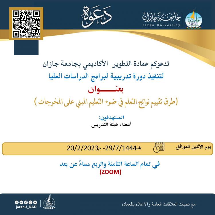 دورة (طرق تقييم نواتج التعلم في ضوء التعليم المبني على المخرجات) عبر برنامج ZOOM. نفذها الدكتور السيد عبد الحميد مستشار عمادة التطوير الأكاديمي، بحضور عميد العمادة الدكتور/ على هندي ووكيل العمادة الدكتور هيثم حديدي.
