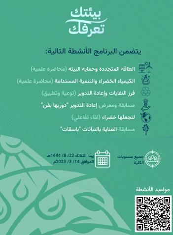 تفعيلاً لأسبوع البيئة ٢٠٢٣، تقدم الكلية التطبيقية بصامطة برنامجاً توعياً "بيئتك تعرفك" والذي يهدف إلى رفع مستوى الوعي البيئي وتعزيز السلوكيات البيئية الإيجابية لدى منسوبات الكلية من تنظيم وكالة الكلية للبحث والتطوير بالتعاون مع الأقسام الأكاديمية والوحدات المساندة بالكلية.