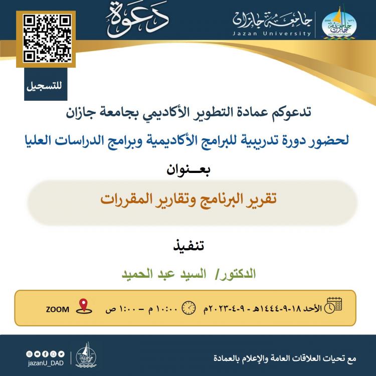 نظمت عمادة التطوير الأكاديمي دورة بعنوان : إعداد تقرير البرنامج وتقارير المقررات عبر برنامج ZOOM نفذها الدكتور السيد عبد الحميد مستشار عمادة التطوير الأكاديمي، وبحضور الدكتور على هندي عميد عمادة التطوير الأكاديمي، ووكلاء العمادة الدكتور هيثم حديدي والدكتورة طاهرة زيلعي حيث استهدفت أعضاء هيئة التدريس.