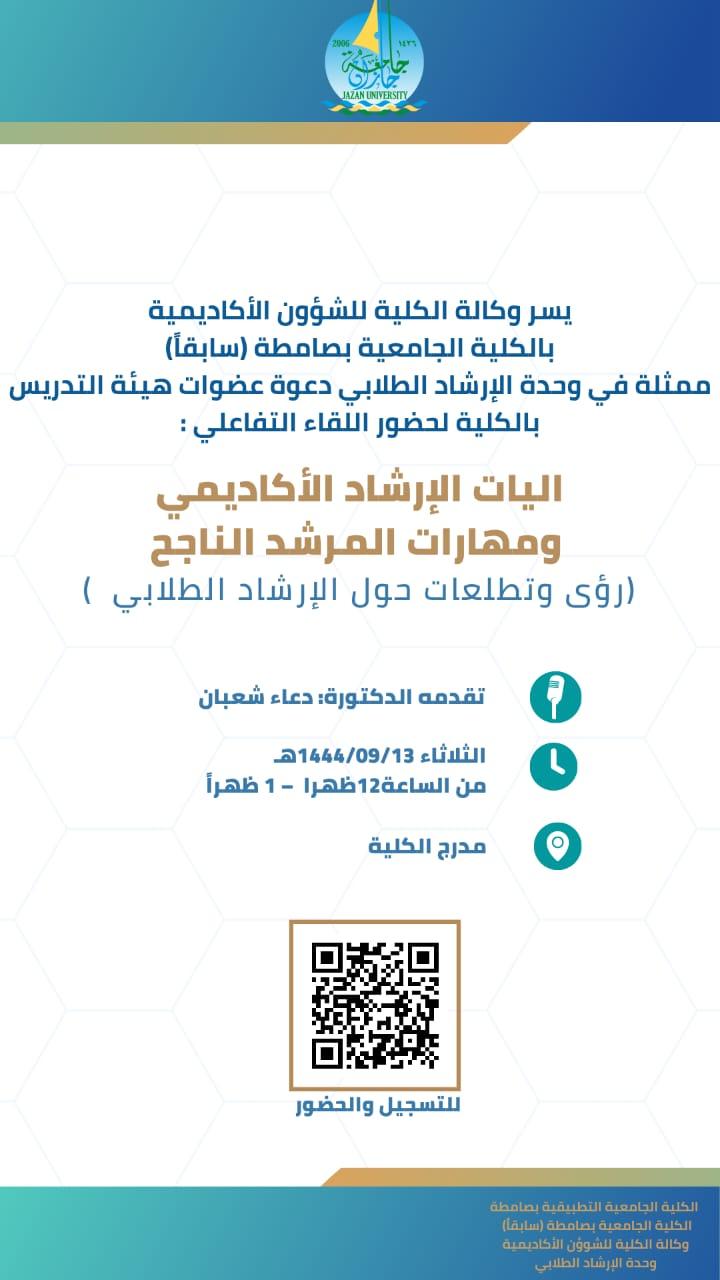 أقامت الكلية التطبيقية بصامطة ممثلة في وحدة الإرشاد الطلابي لقاء تفاعلي بعنوان "آليات الإرشاد الأكاديمي ومهارات المرشد الناجح".