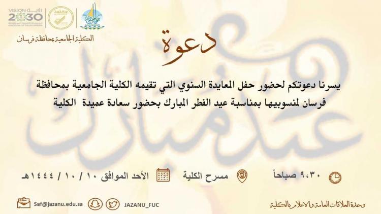 أقامت الكلية الجامعية بفرسان برعاية عميدة الكلية الدكتورة عفاف محمد با بعير حفل المعايدة السنوي الذي تقيمه الكلية لمنسوبيها بمناسبة عيد الفطر المبارك.