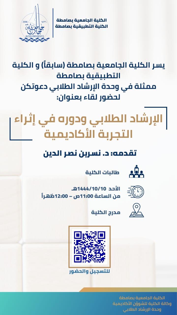 نفذت الكلية التطبيقية بصامطة و الكلية الجامعة بصامطة (سابقا) ممثلة في وحدة الارشاد الطلابي لقاءً تفاعلياً مع طالبات الكلية بعنوان "الإرشاد الطلابي ودوره في إثراء التجربة الأكاديمية". أدارته د. نسرين نصر الدين، وتطرقت فيه لأبرز الخدمات الإرشادية التي تقدمها الوحدة وأكدت على أهمية الاستعانة بالمرشدة الأكاديمية خلال المسيرة الجامعية، كما استعرضت عدداً من النصائح والممارسات المثلى لتحقيق تجربة أكاديمية متميزة.