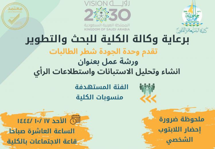 برعاية وإشراف وكالة كلية الشريعة والقانون للبحث والتطوير نفذت منسقة وحدة الجودة بالكلية شطر الطالبات د. شيماء عبدالصبور ورشة عمل بعنوان إنشاء وتحليل الاستبانات واستطلاعات الرأي استهدفت منسوبات الكلية من عضوات الهيئة التدريسية والهيئة الادارية.