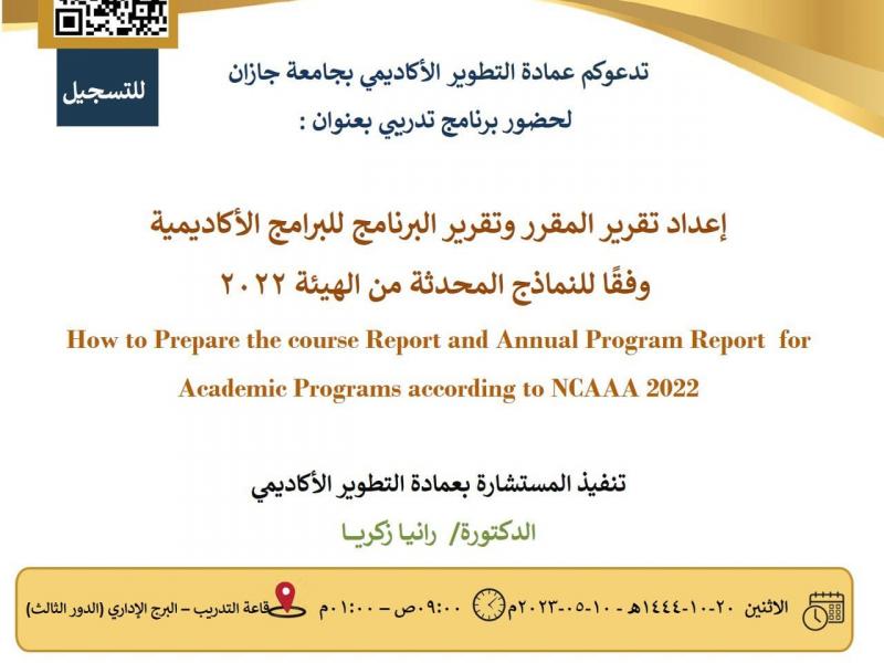 نفذت عمادة التطوير الأكاديمي برنامجا تدريبيا بعنوان "إعداد تقرير المقرر والتقرير السنوي للبرنامج وفقاً للنماذج المطورة للمركز الوطني للتقويم والاعتماد الأكاديمي 2022".